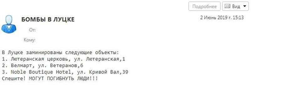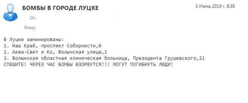 Раніше повідомлялося, що електронні адреси, з яких повідомляли про замінування ряду об’єктів у Луцьку та інших містах, "живуть" 10-15 хвилин.