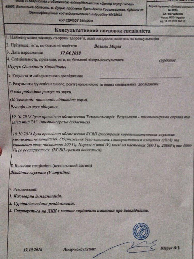 Через надмірну кількість ліків, які дівчинка приймала із самого народження, вона повністю втратила слух. Після пройдених обстежень КСВП їй поставили діагноз «Двобічна глухота (V ступінь)».