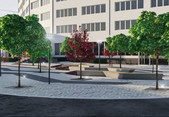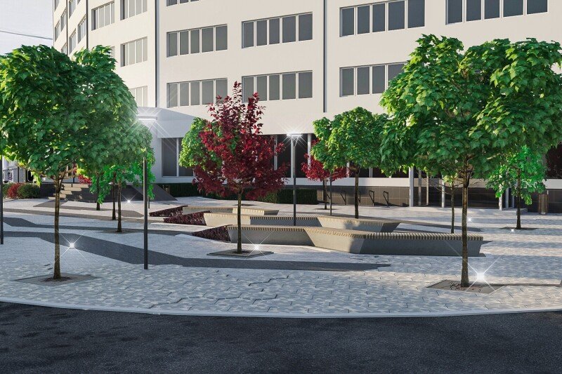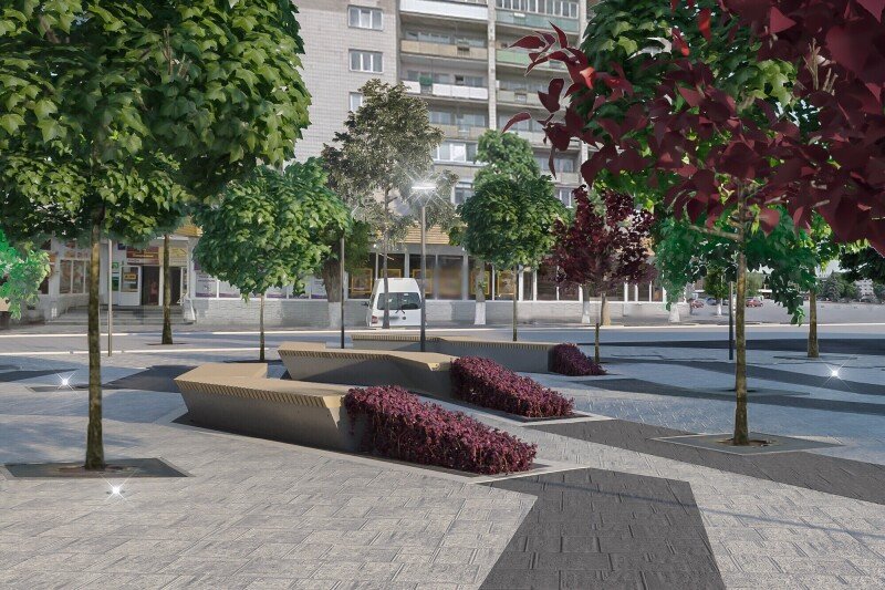 Освітлюватимуть зону ліхтарі і точкові світильники на бруківці. Бетонні лавочки з дерев’яним покриттям будуть у формі зигзагів. Вони повторюватимуть візерунки плитки.