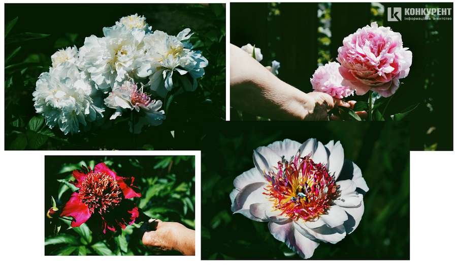 Waikiki, Mister Ed (квіти мають пелюстки на половину білі і рожеві, або з одного куща ростуть двох різних кольорів), Victorian Blush, Sarah Bernhardt – усі ці сортові півонії ростуть на подвір’ї у луцької сім’ї.