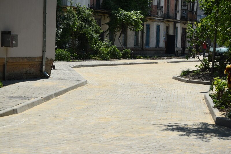 «Ремонт прибудинкових територій в цьому дворі робився разом із введенням в експлуатацію будинків, - розповів Григорій Недопад. - Фактично було тільки підсипання ям для того, щоб зберегти проїзди для автомобілів. Зараз тут на великій території вкладена бруківка з використанням тактильної плитки для зручності громадян з обмеженими фізичними можливостями. З моста проспекту Перемоги є сходи, тому ми дбаємо, щоб нашим мешканцям було зручно».