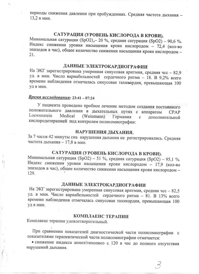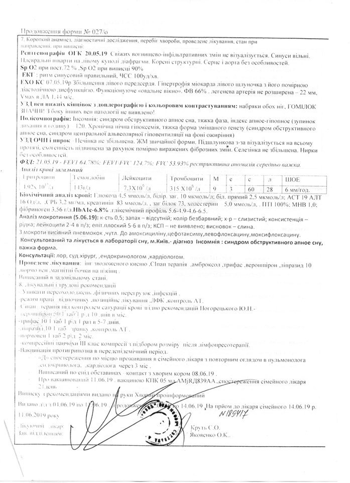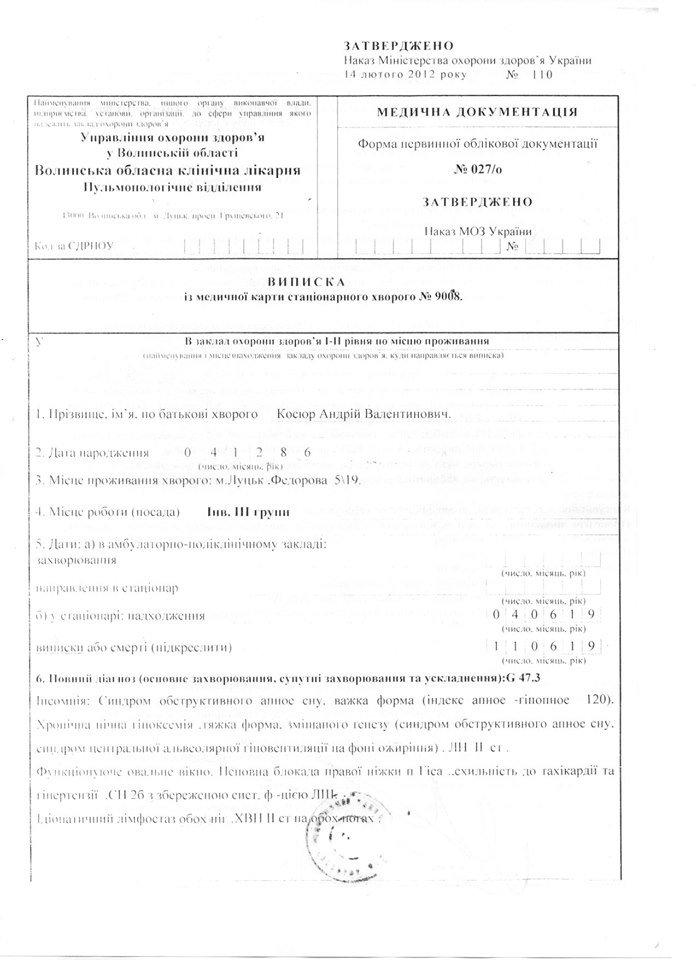 Поставлені такі діагнози: Інсомнія - синдром обструктивного апное сну, важка форма. Хронічна нічна гіноксемія, тяжка форма, змішаного генезу.