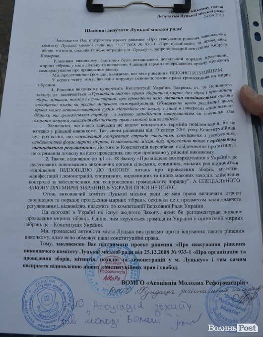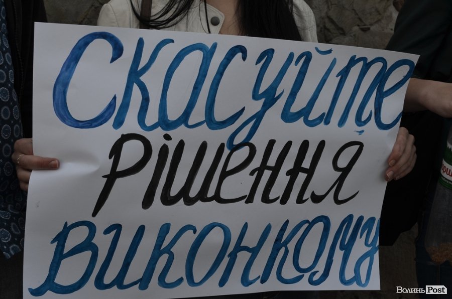 Учасники пікету підготували звернення до депутатів Луцької міської ради, прокурора міста Сергія Даніліня та виконавчого комітету. Вони вимагають скасувати неконституційне рішення.