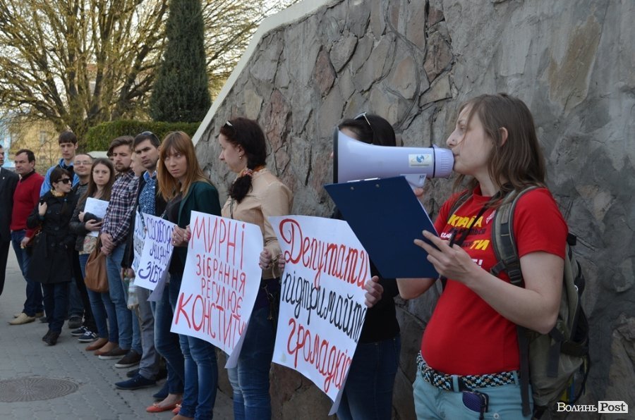 Акція «Ми вільні збиратися вільно» під стінами Луцької міської ради 24 квітня зібрала близько 40 учасників, які вимагали скасувати рішення виконкому, який регулює мирні зібрання в Луцьку.