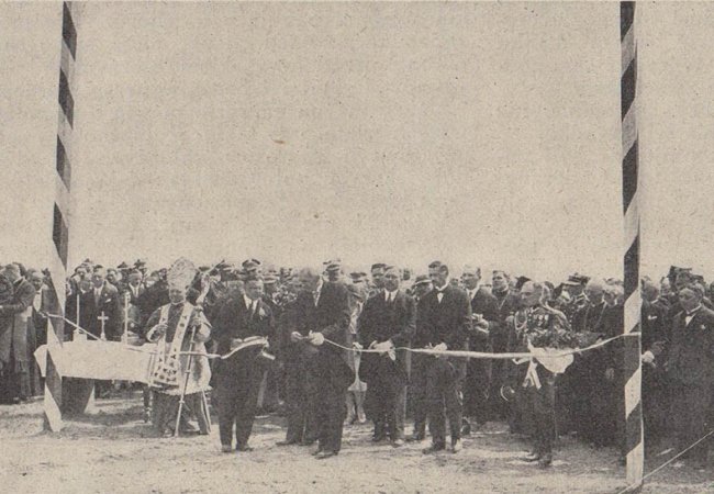 На фотографії Ігнацій Мосціцький урочисто перерізає стрічку на щойно освяченому Луцькому військовому аеродромі. Зліва біля стола в церковному вбранні стоїть Адольф Шельонжек.