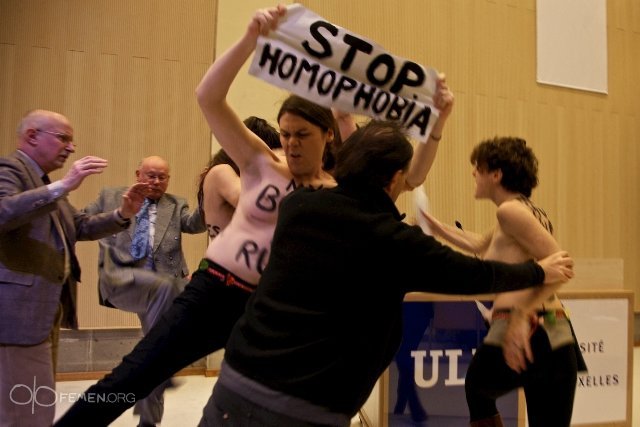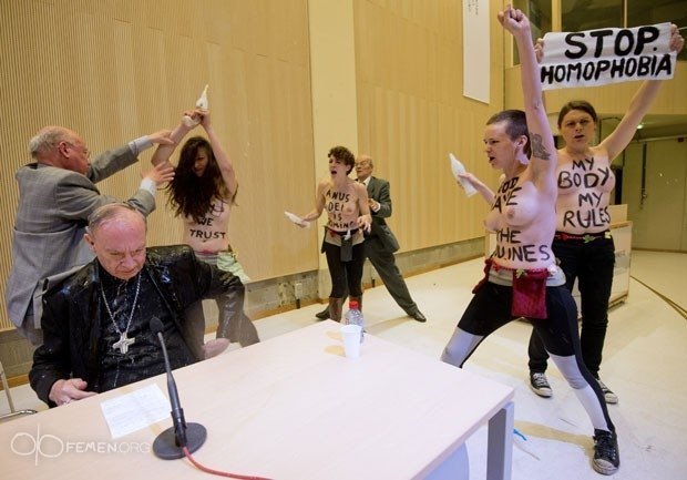 Оголені по пояс дівчата з написами на тілі «Зупинити гомофобію!», «Господь, бережи лесбіянок!» підбігли до столу, де сидів священик, і облили його святою водою з пляшок у формі Святої діви Марії.