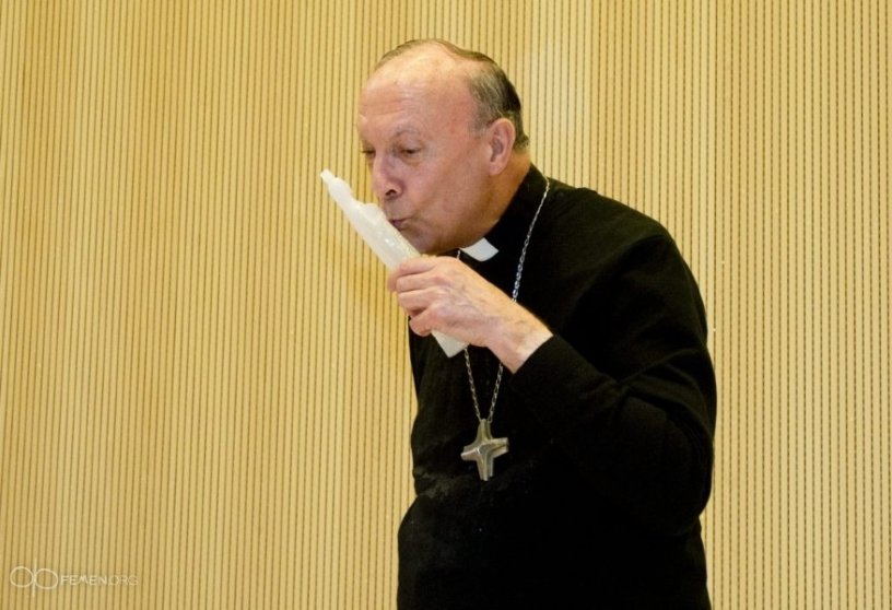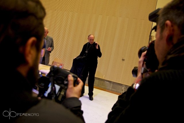 Активістки брюссельського відділення руху FEMEN у день легалізації одностатевих шлюбів у Франції атакували главу Католицької церкви Бельгії архієпископа Леонарда.
