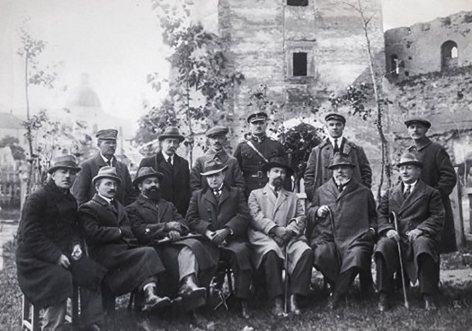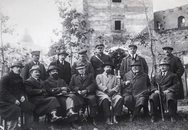 Луцькі владці позують для колективного фото на фоні замку. РЕТРОФОТО