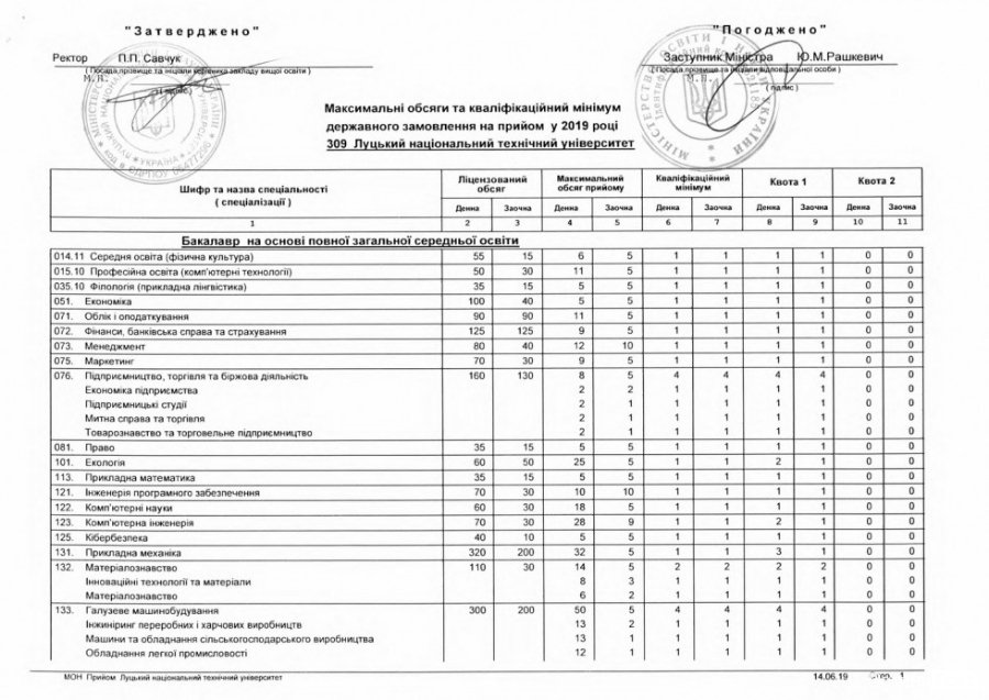 Скільки бюджетних місць виділили луцьким вишам на 2019 рік