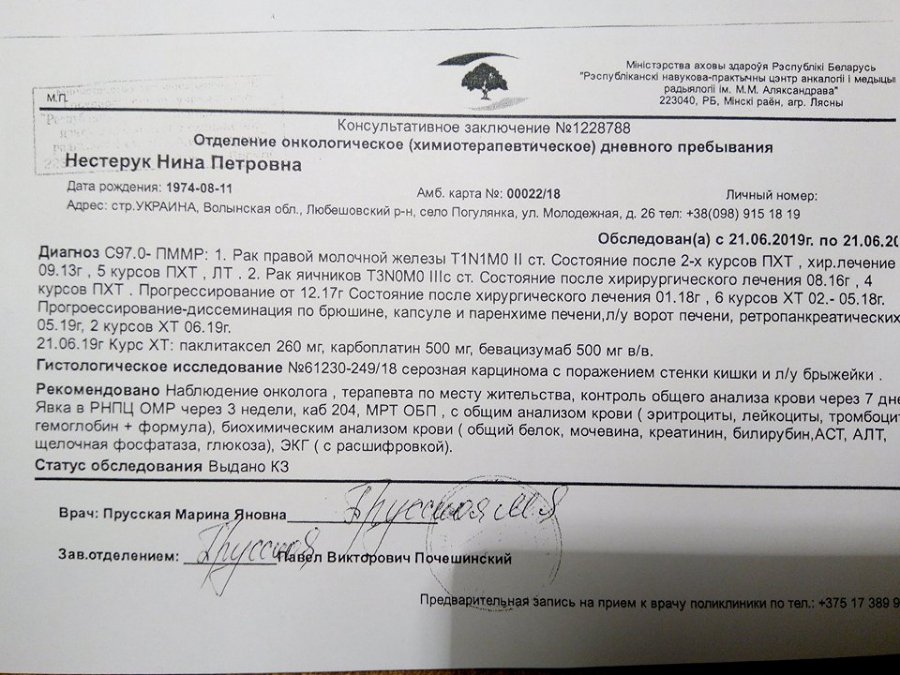 «Після нашого приїзду з Туреччини мама пройшла обстеження в Рівному, а потім в Мінську. Висновок: рецидив онкологічного захворювання. Протягом цього часу (травень-червень) в Білорусії вона пройшла два курси хіміотерапії. Наступним кроком буде повторне обстеження для визначення динаміки і подальшого лікування. Наша боротьба продовжується! Один курс хіміотерапії коштує 800 доларів, скільки їх буде потрібно лікарі визначать з обстеження», - пише Мар`яна Нестерук.