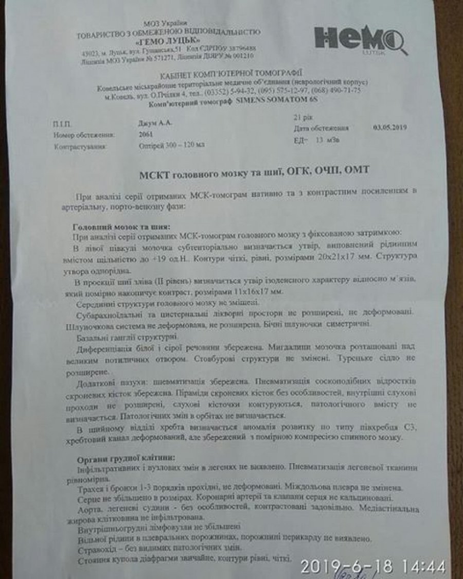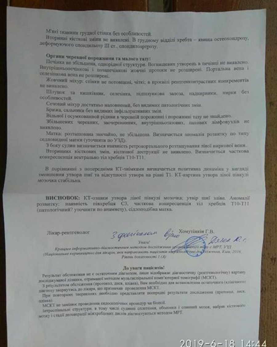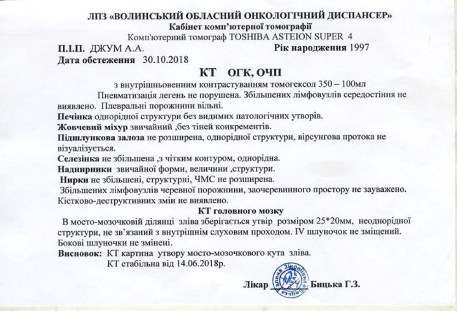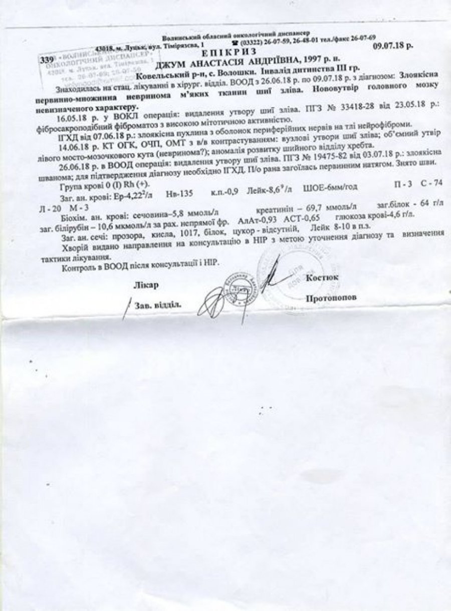 Робили ще МРТ на голову. В голові також є пухлина, також операція. Дякую всім людям, хто допомагав мені і допомагає зараз в тяжкий час. Дай боже всім здоров'я і божого благословення», – розповідає Анастасія Джум.
