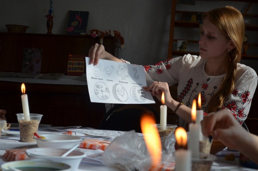 Майстриня Катерина Пащук підготувала для присутніх презентацію про писанкарство. Вона розповіла про символіку кольорів писанки, символіку орнаментів. Особливий акцент зробила на символі хреста.