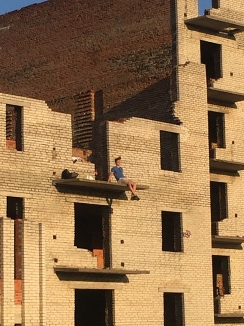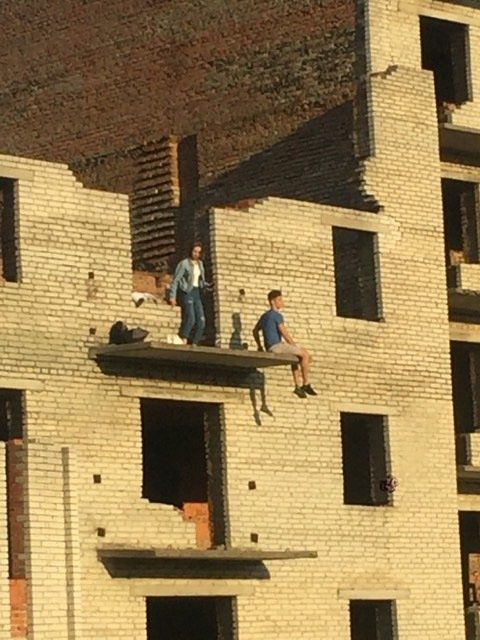 На фото можна побачити, як підліток сидить на краю недобудованого балкону 5 поверху, звісивши ноги униз.
