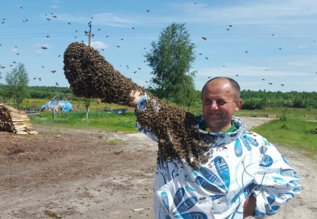 Пасічник Віталій Мартинюк із села Тоболи може голими руками взяти рій бджіл і насадити його на себе.