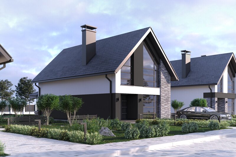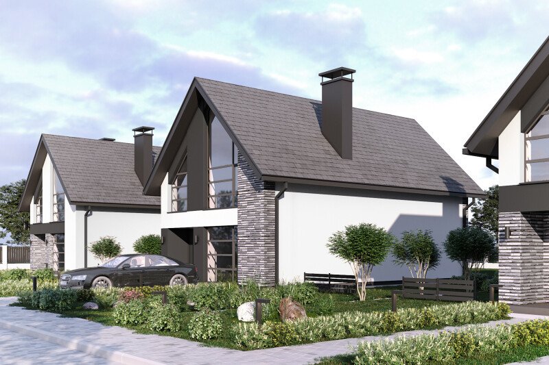 Котедж площею 156,06 м² розташований у житловому комплексі "Струмочок" за проектом американського зразка. Спереду будинків не буде парканів, лише стильні зелені газони.