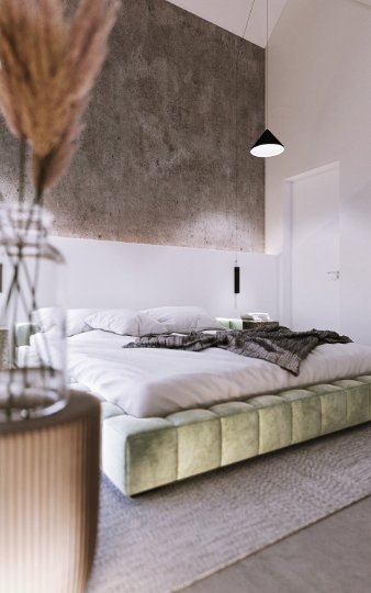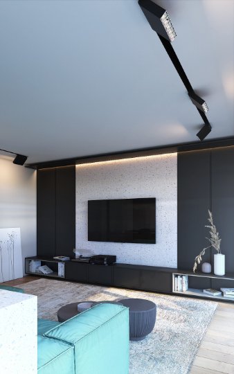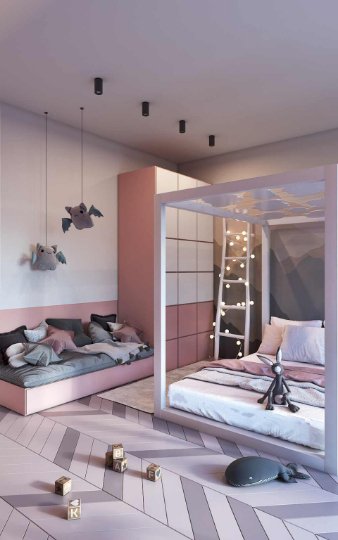 Кімнату пропонують облаштувати спеціальними лампочками, не дуже яскравими, але розташованими по одній направляючій, завдяки чому в кімнаті вечорами буде м'яке розсіяне світло.