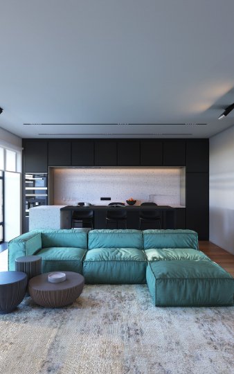 Центральний елемент дизайну - диван, який можна використовувати і для відпочинку перед телевізором, і в їдальні, наприклад, щоб випити кави перед дверима на терасу.