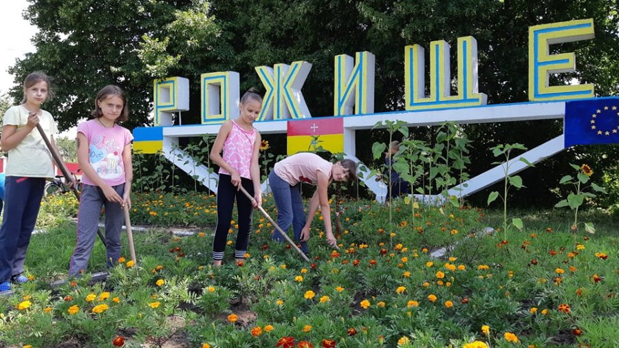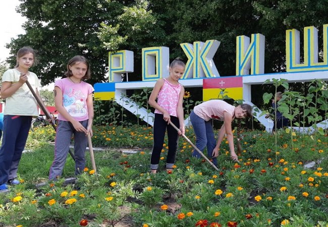 Біля в'їзного знаку "Рожище" школярі облагородили клумбу з чорнобривцями.