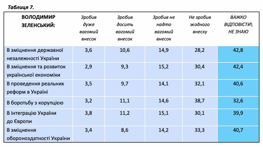З огляду на нетривалий термін перебування Володимира Зеленського на посаді президента, респонденти в основному або не змогли оцінити його внесок у розвиток країни, або вказували на відсутність такого вкладу.