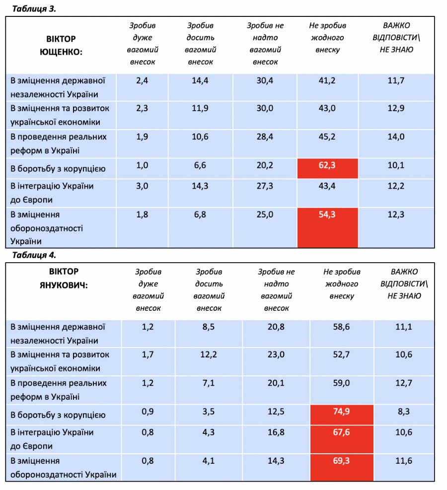 Респонденти здебільшого не бачать суттєвого внеску в розвиток країни з боку Віктора Ющенка і Віктора Януковича. При цьому найбільш негативно оцінюють заслуги Віктора Януковича.