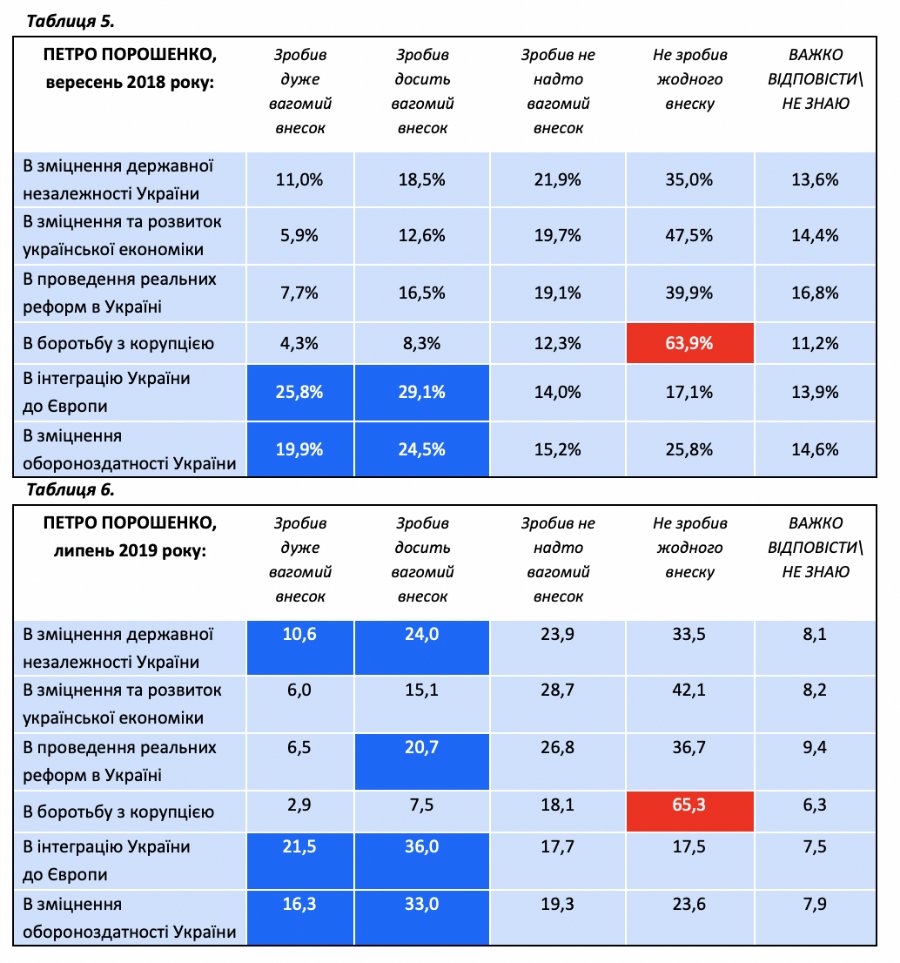 Більшість респондентів визнають значний внесок Петра Порошенка в більшості з напрямів розвитку країни, особливо в інтеграцію в Європу і в зміцнення обороноздатності. За останній рік оцінки його заслуг помітно поліпшилися. Слабким місцем в його роботі, на думку більшості опитаних, була і залишається боротьба з корупцією.