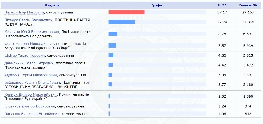 Тож, перемогу, а отже й депутатський мандат від Луцька здобуває поки чинний голова Волиньради Ігор Палиця (самовисування). У нього - 37,17% голосів виборців (29 157 людей).