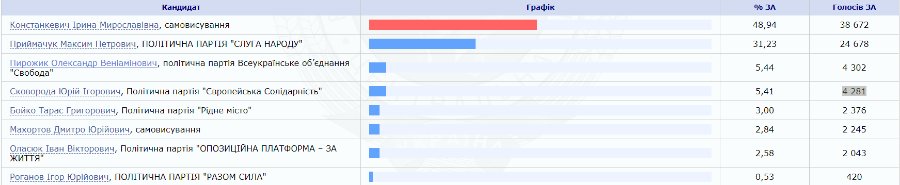 Друге місце здобув Приймачук Максим Петрович, кандидат від партії «Слуга народу». За нього проголосувало 31,23% голосів ( 24 678 людей).