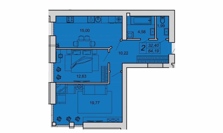 Двокімнатна квартира може бути площею 64,19 та 68 квадратів. Планування в обох квартир схоже: із коридору є вхід до двох кімнат, кухні та роздільного санвузла.