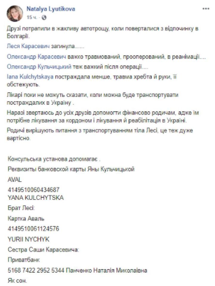 "Друзі потрапили в жахливу автокатастрофу, коли поверталися з відпочинку в Болгарії. Леся Карасевич загинула ...... Олександр Карасевич важко травмований, прооперований, в реанімації .... Олександр Кульчицький теж важкий після операції .... Iana Kulchytskaya постраждала менше , травма хребта і руки, її обстежують", - написала член правління громадської організації "Громада Гори" Наталія Лютікова.