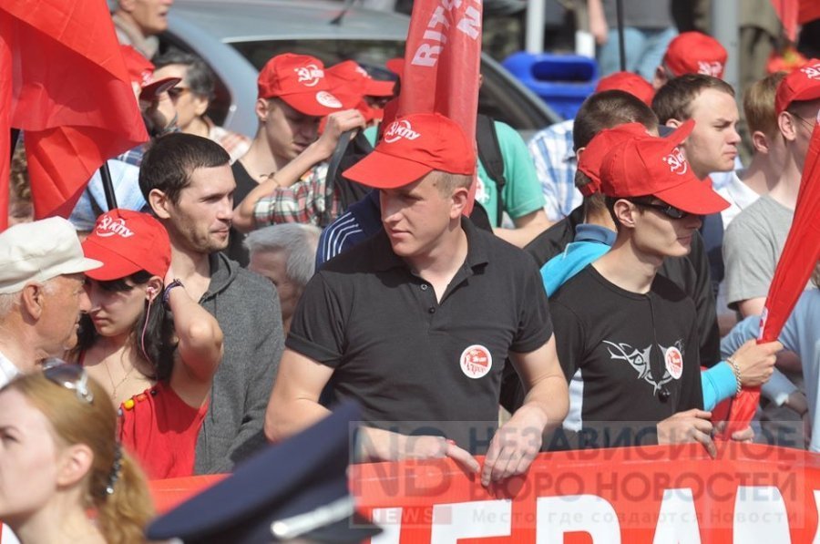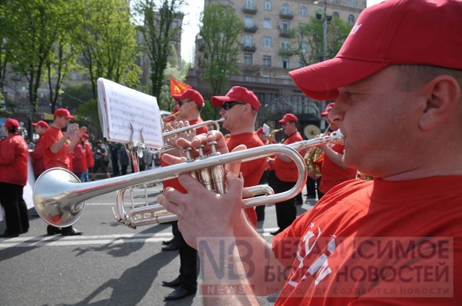 Учасники сформували колони. У руках у них прапори Компартії України, транспаранти на підтримку Митного союзу, з антифашистськими гаслами. На багатьох ‒ червоні кепки, футболки з комуністичною символікою ‒ серп і молот.