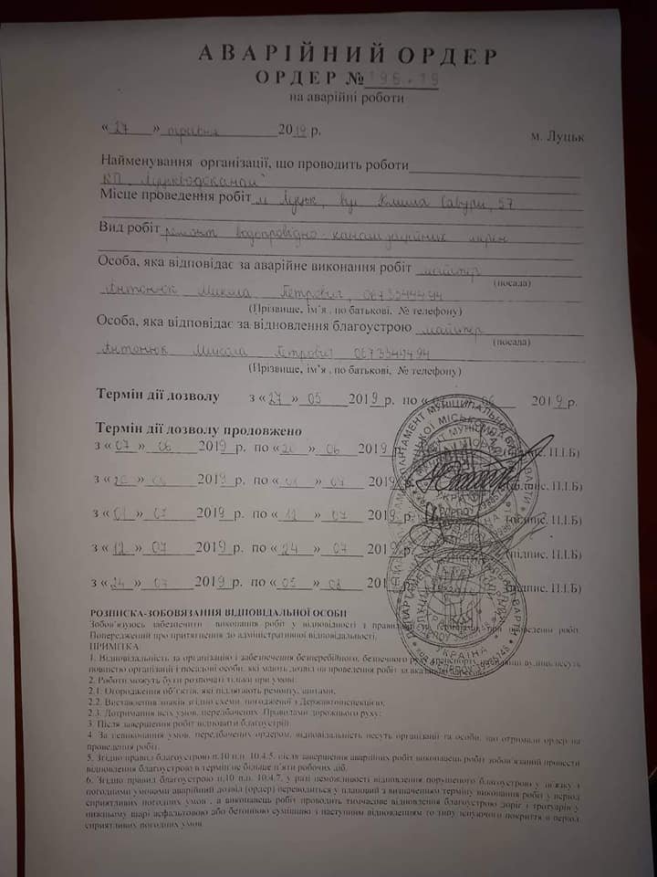 В зв’язку з просіданням землі після проведення земляних робіт, зруйнувалось щойно покладене асфальтне покриття. Термін дії ордерів ще не завершився, відновлювальні роботи КП «Луцкводоканал» продовжуються. Після закінчення терміну дії ордерів проведуть перевірку належного стану благоустрою.
