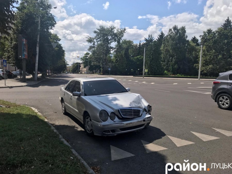 У центрі Луцька на кільці біля історичного факультету Східноєвропейського національного університету імені Лесі Українки стоїть автомобіль без державних номерних знаків.