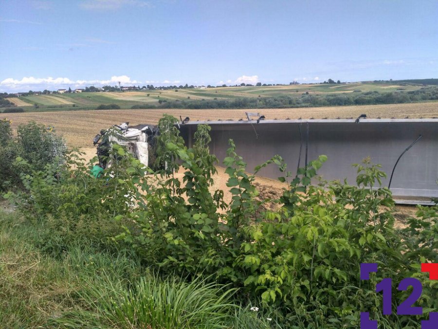 Вантажівка із зерном злетіла у кювет і перевернулася на поле.