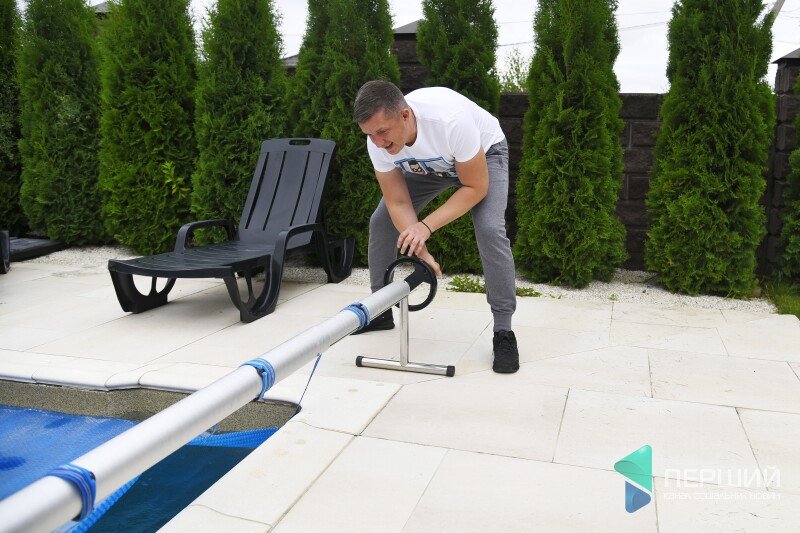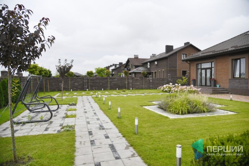 Зелений стрижений газон переплітають доріжки з бруківки. Уздовж мурованого паркану – клени, туї, сакури і… ще якісь кущі. В кутку голубіє басейн. За огорожею червоніють стіни нового будівництва – росте новий «Струмочок».