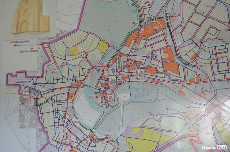 «Самі каналізаційні системи облаштували приблизно у 1932-1934 роках, з того часу їх не замінювали, лише проводили маленькі ремонтні та реконструкційні роботи», – починає розповідати Сергій Строк. «Перші ж водогони каналізаційно-насосних станцій (далі КНС, – ред.), які приймають і перекачують стічні води без грубих домішків, у Луцьку збудували на вулиці Іови Кандзелевича, тоді та станція була під’єднана до парку культури та відпочинку імені Лесі Українки, щоправда тоді це були лише луки, а не парк, звідки відкачували воду у бік вулиці Ковельської. Згодом, на початку 1947-го року, цю станцію ліквідували, а замість неї встановили іншу КНС», – інженер паралельно показує відповідні локації на великій мапі водопровідних установ міста, де також зображені усі КНС Луцька та району.