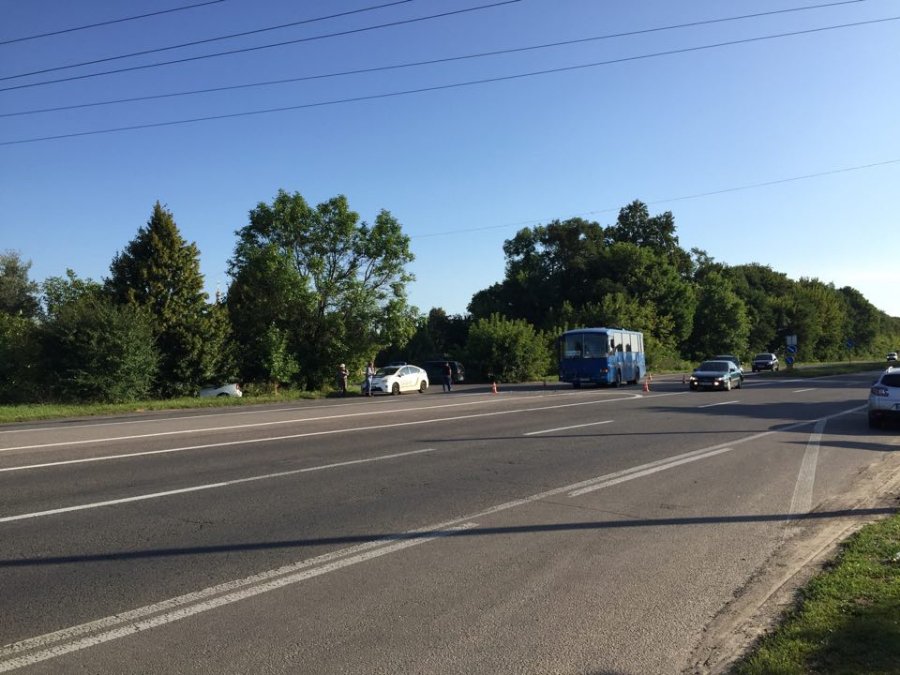 Через зіткнення автобуса та легковика останнього викинуло з траси. Зазначимо, що через удар спрацювала подушка безпеки.