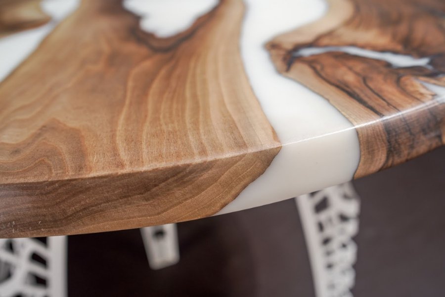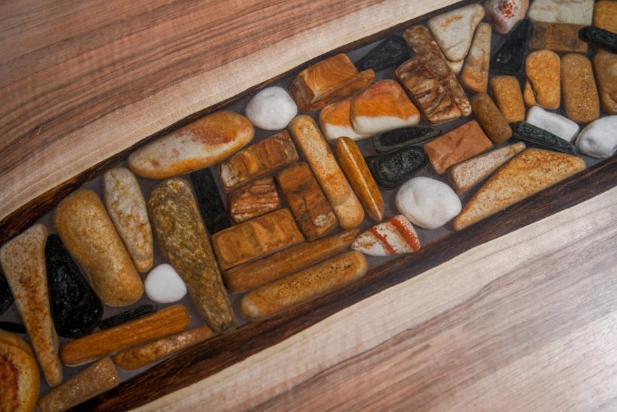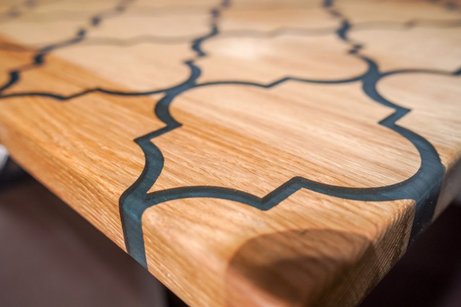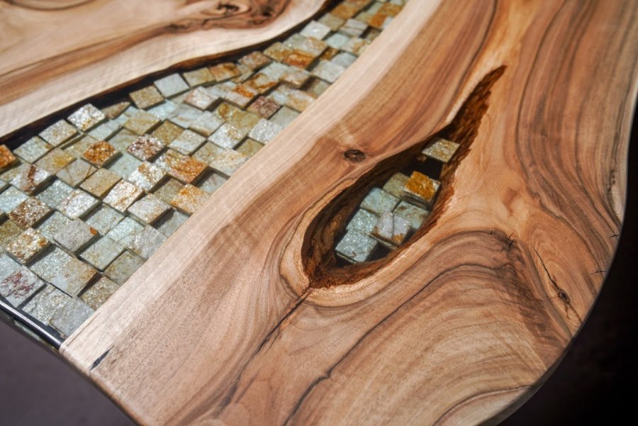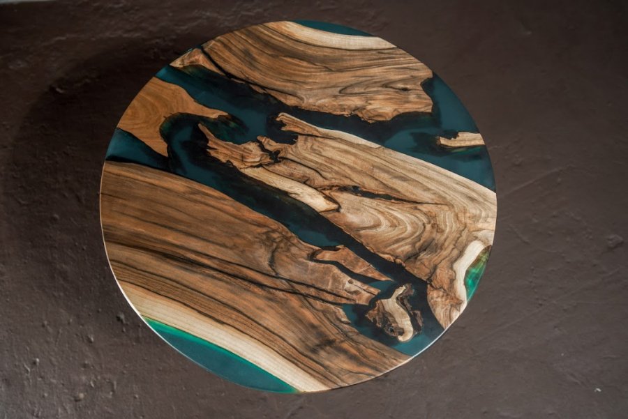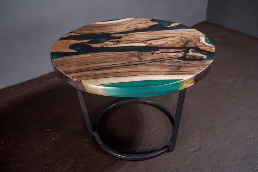 Епоксидна смола прекрасна тим, що після затвердіння вона чудово тримає форму, міцна і не токсична. А в поєднанні з натуральним деревом підкреслює вишуканість породи, зберігши його натуральний колір і захистивши його. До того ж природна прозорість дозволяє додати в смолу будь-які декоративні деталі, поєднуючи її з барвниками.