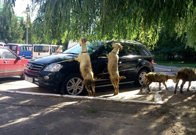 У Нововолинську стався курйоз – кози оточили автівку Mercedes.