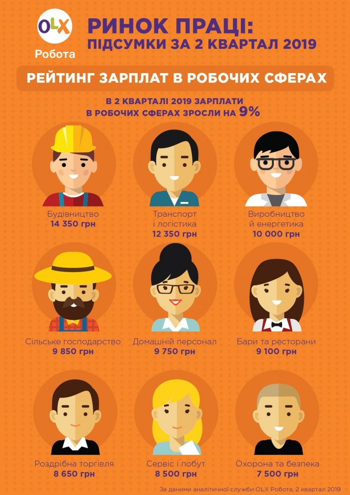 Зазначається, що у робочих сферах зарплати за останній квартал виросли у середньому на 9%.