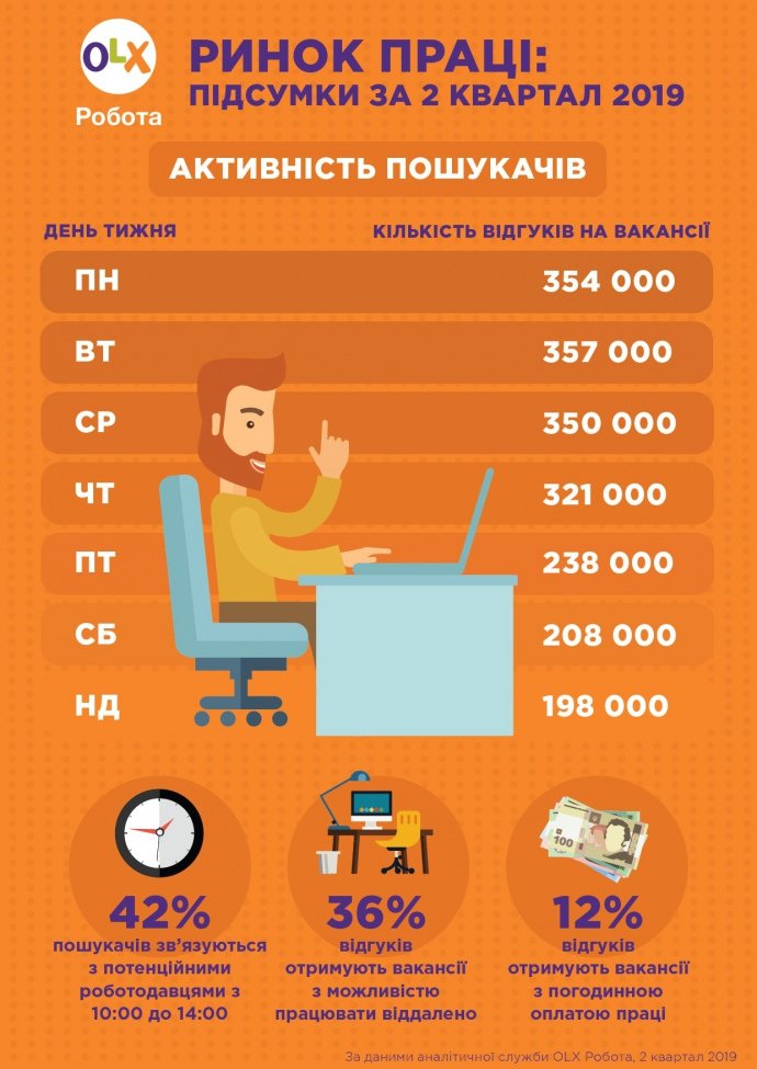 Зазначається, що за другий квартал 2019 року на платформі OLX було розміщено понад 50 тисяч робочих вакансій. Пік пошуку співробітників припав на травень - більше 18 тисяч пропозицій.