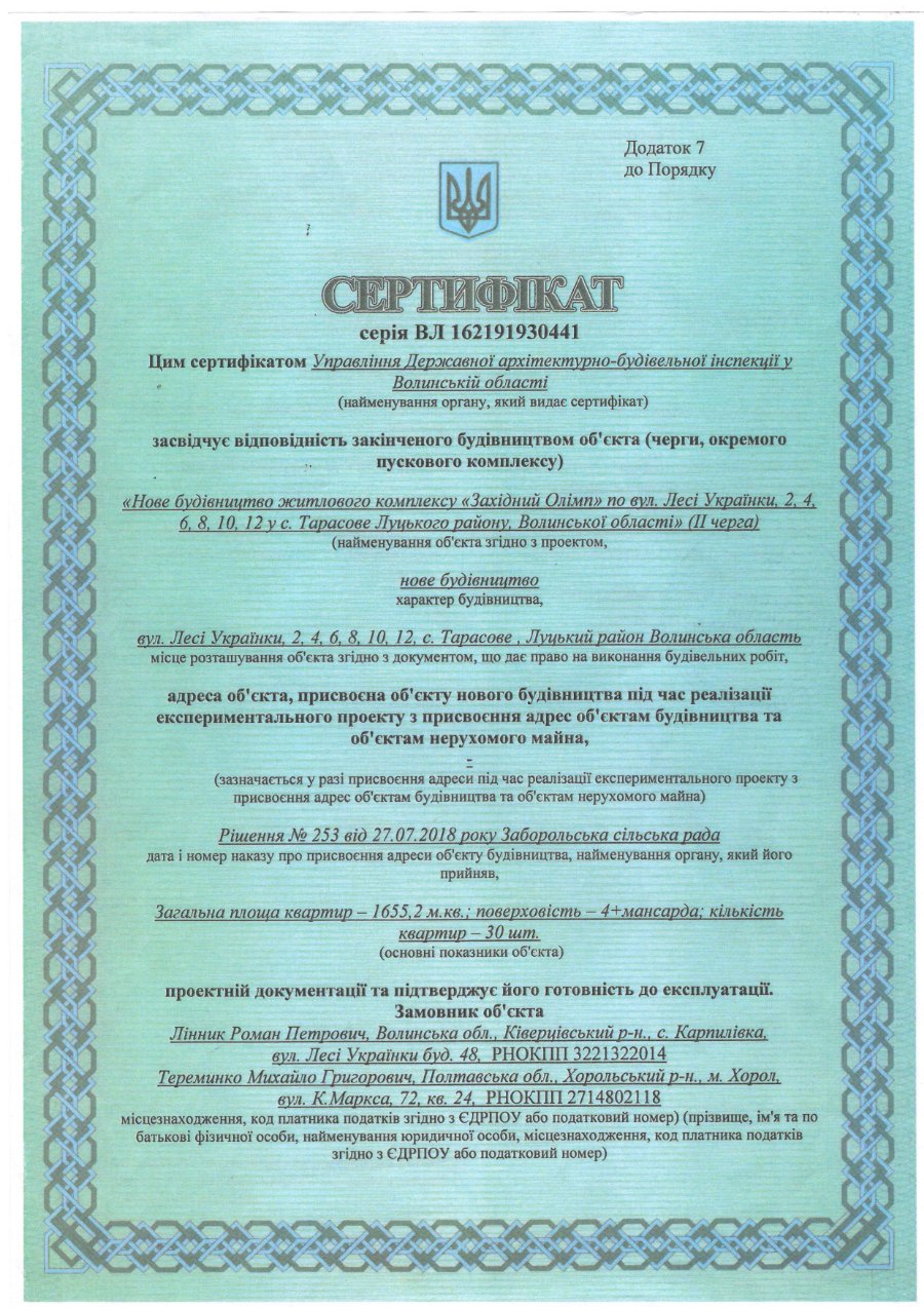 У новому сучасному житловому комплексі «Західний Олімп», що розташований у передмісті Луцька – селі Тарасове, мешканці почали облаштовувати свої домівки у будинку другої черги відразу після отримання сертифікату відповідності.