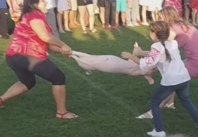 Під час святкування на сільському стадіоні в селі Забороль організатори влаштували конкурс. Люди накинулися на двох поросят і почали тягнути їх у різні сторони.