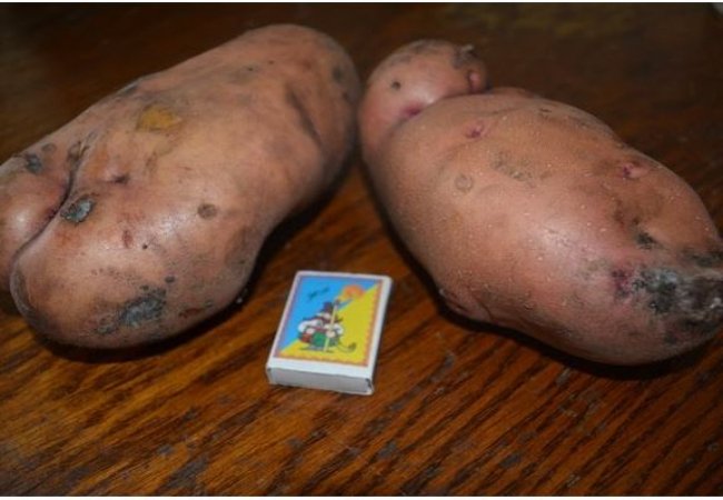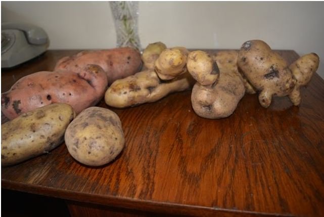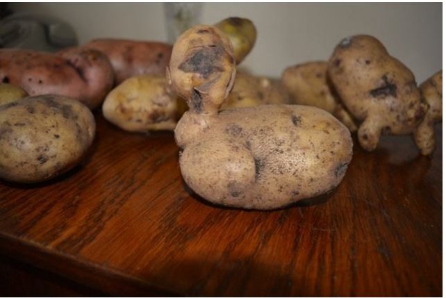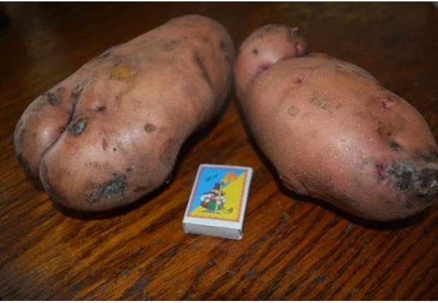 Жінка на підтвердження своїх слів показала величезні картоплини та такі, які схожі на різних звіряток. Є подібні до качечки, до голови корови та інші чудасії.