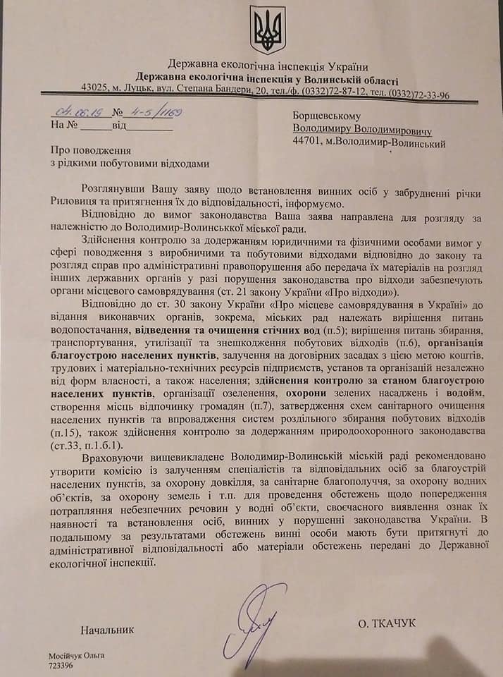 “Суть полягає в тому, що жителі прибережної зони вивели свою каналізацію прямо в річку. На фото нижче видно одну із таких труб по яким, за словами пана Володимира, постійно витікають нечистоти. Направивши звернення до Володимир-Волинської міської ради та Державна екологічна інспекція України Володимир отримав відповідь від екологів про те, що вони тут безсилі і вся відповідальність, за їхніми словами, лежить на органі місцевого самоврядування. Від міської ради Володимир взагалі не отримував відповіді.”, – йдеться у дописі Тараса Сватка.