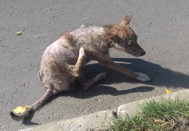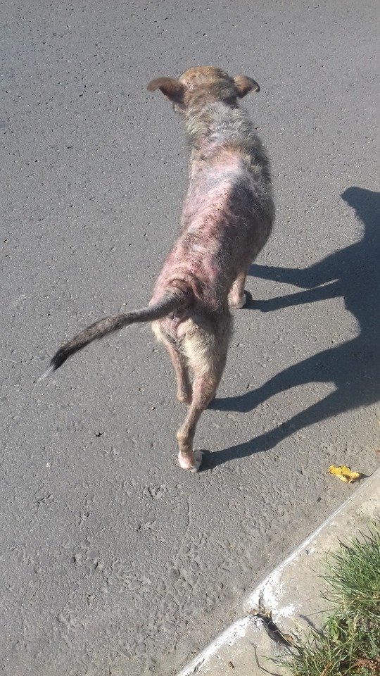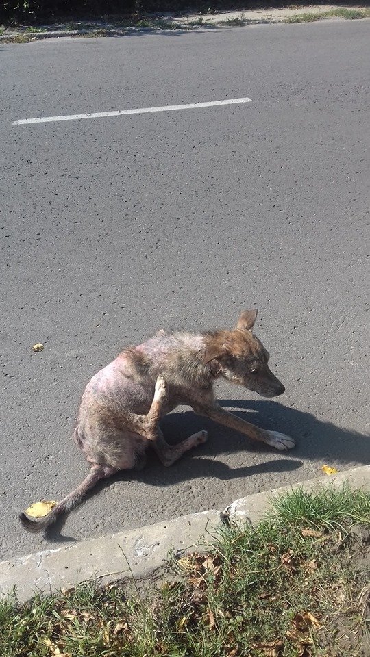 Перебуваючи у справах у місті Рожище, побачила жахливу картину: біля Райдержадміністрації сиділа зовсім нещасна тваринка майже повністю без шерсті і постійно чухалась...