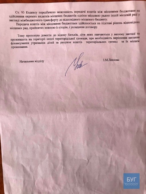 Директору школи Юрію Савраюку надіслали відповідний лист з відділу культури виконавчого комітету Нововолинської міської ради про умови фінансування. В ньому йдеться про те, що має платити громада, на території якої проживають діти.