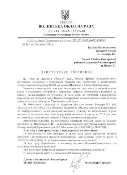 Що там Камінь-Каширський. От у Луцьку на проспекті Волі 70, майже поруч з облрадою, стоїть триповерховий будинок взагалі без води та без каналізації. Люди по нужді ходять на вулицю у напіврзвалений дерев'яний туалет. А влада затуляє собі очі, щоб не бачити бідкання 12 сімей, які там проживають.