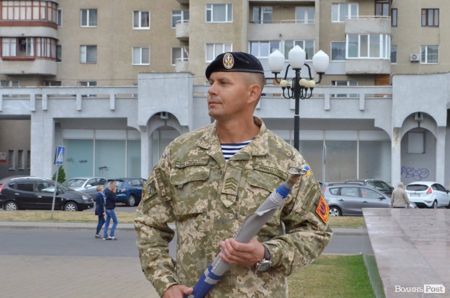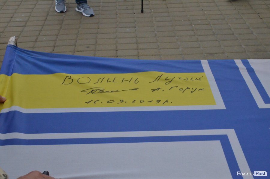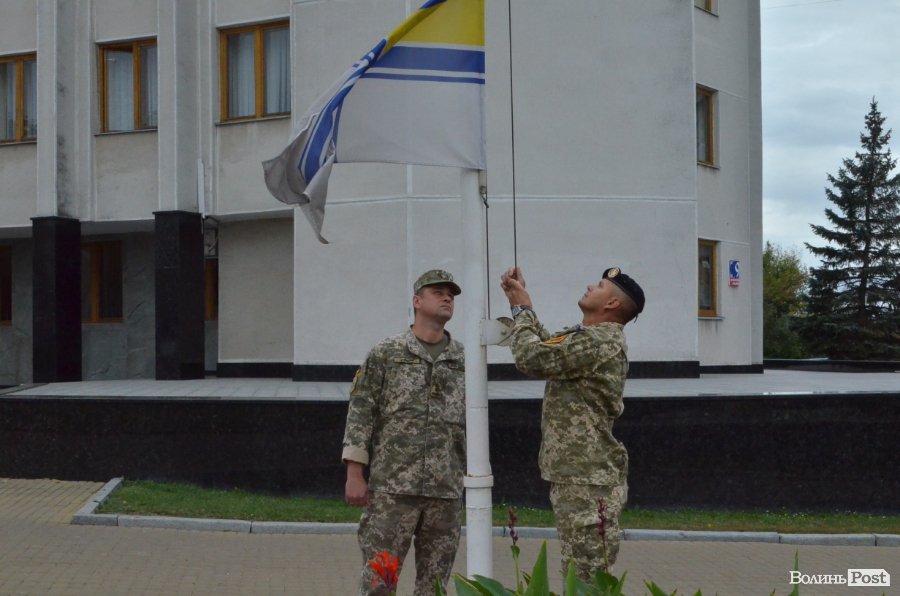 Почесну місію спустити прапор ВМС ЗС України мав учасник АТО, який проходив військову службу в морській піхоті, старший сержант Анатолій Горун. На прапор нанесли пам'ятний напис: «Волинь. Луцьк. 16.09.2019» та підпис військового.