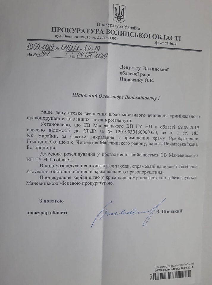 9 вересня внесли відомості до єдиного реєстру досудових розслідувань за ч. 1 ст. 185 КК України щодо викрадення з приміщення храму Преображення Господнього, що в селі Четвертня Маневицького району, ікони "Почаївська ікона Богородиці".