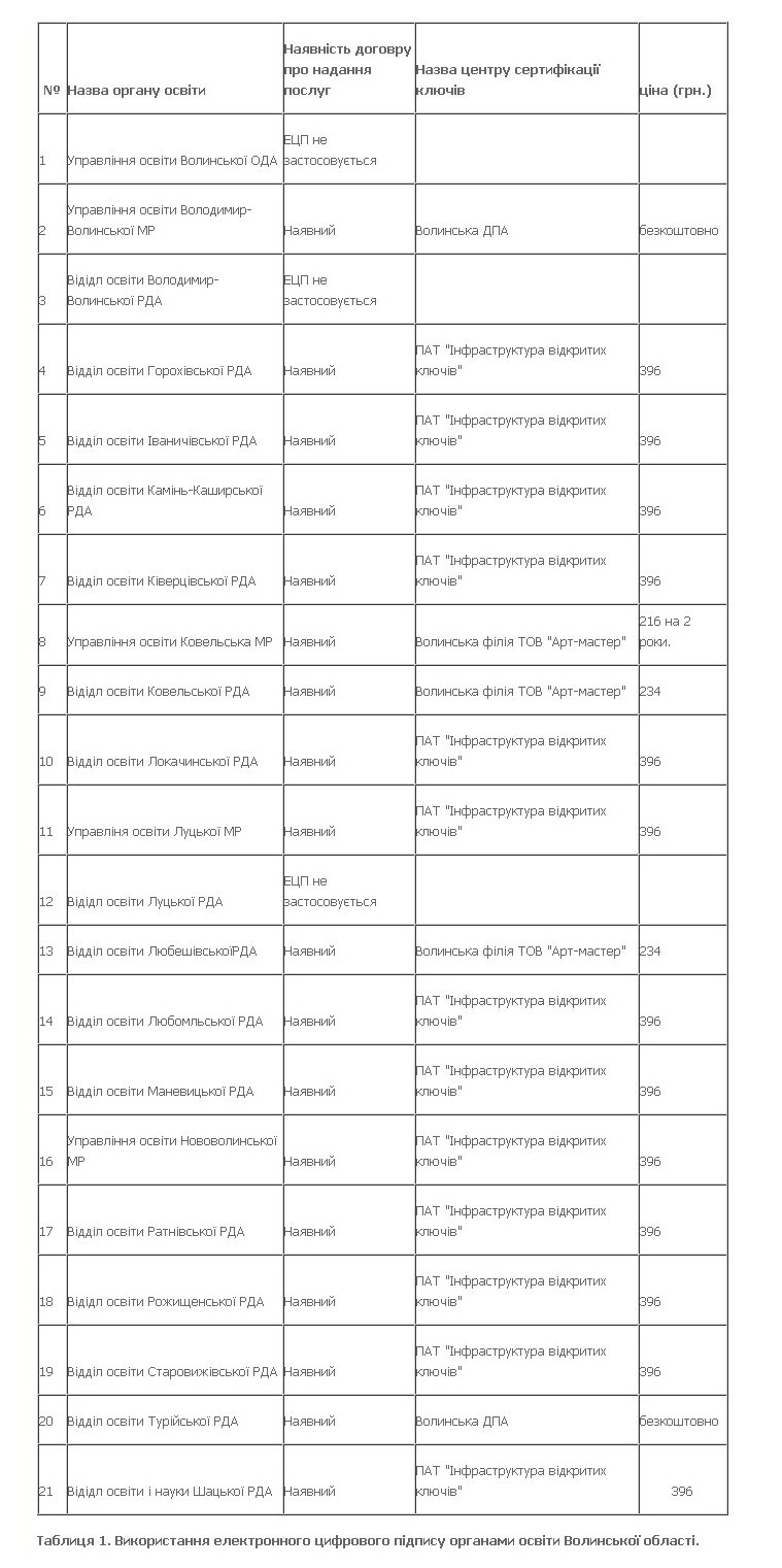 Таблиця 1. Використання електронного цифрового підпису органами освіти Волинської області